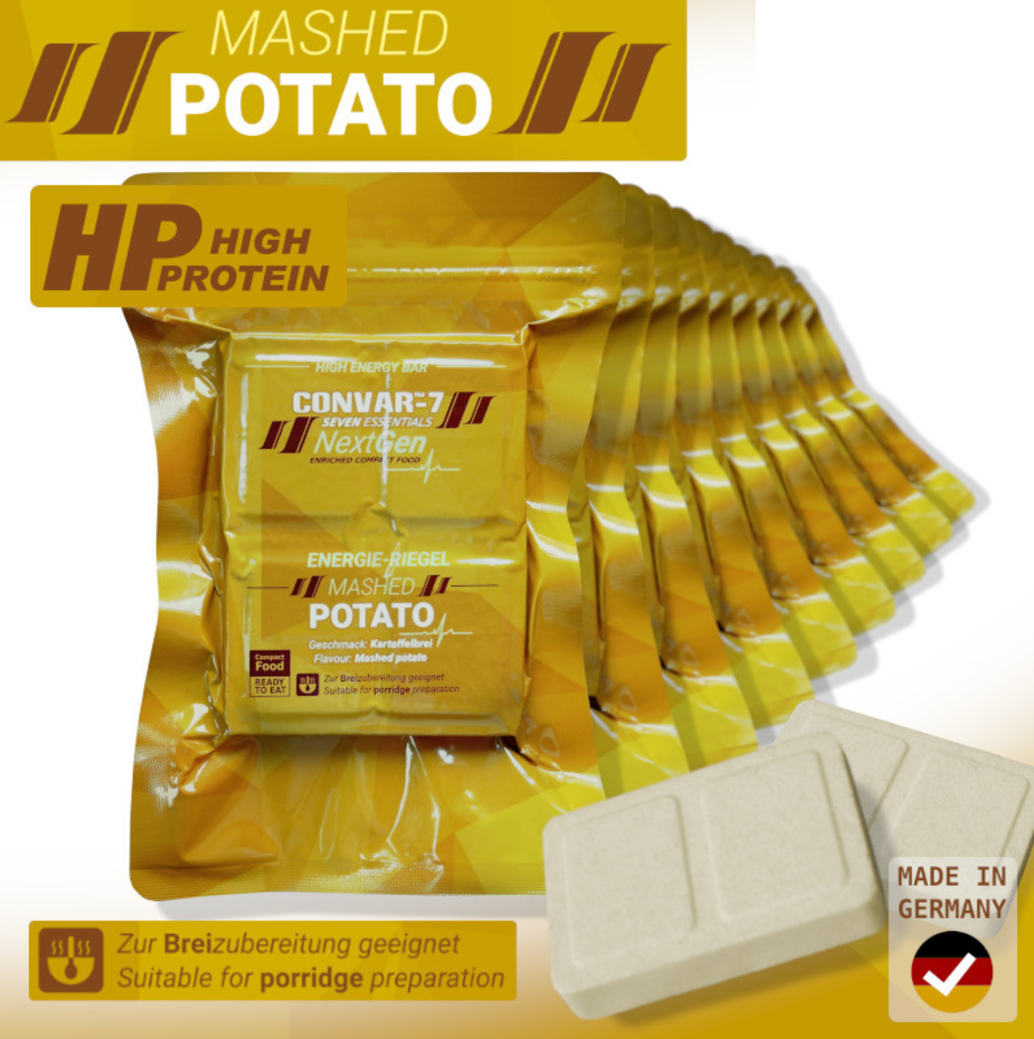 Denne energi bar er en velsmagende bar, der byder på en solid, solid kartoffelsmag. Baren er ikke kun lækker, men har også et særligt højt proteinindhold, er ekstremt nærende og giver langtidsholdbar energi. Baren er specielt designet som en dobbeltbrugsmad, hvilket betyder, at den kan indtages direkte eller tilberedes og spises som en grød ved blot at tilføje væske. Derudover er energibaren kendt for sin lange holdbarhed, hvilket gør den til en ideel ledsager på farten, under sport eller på lange arbejdsdage.