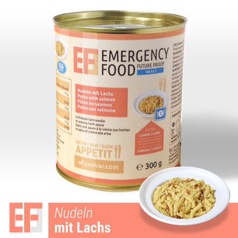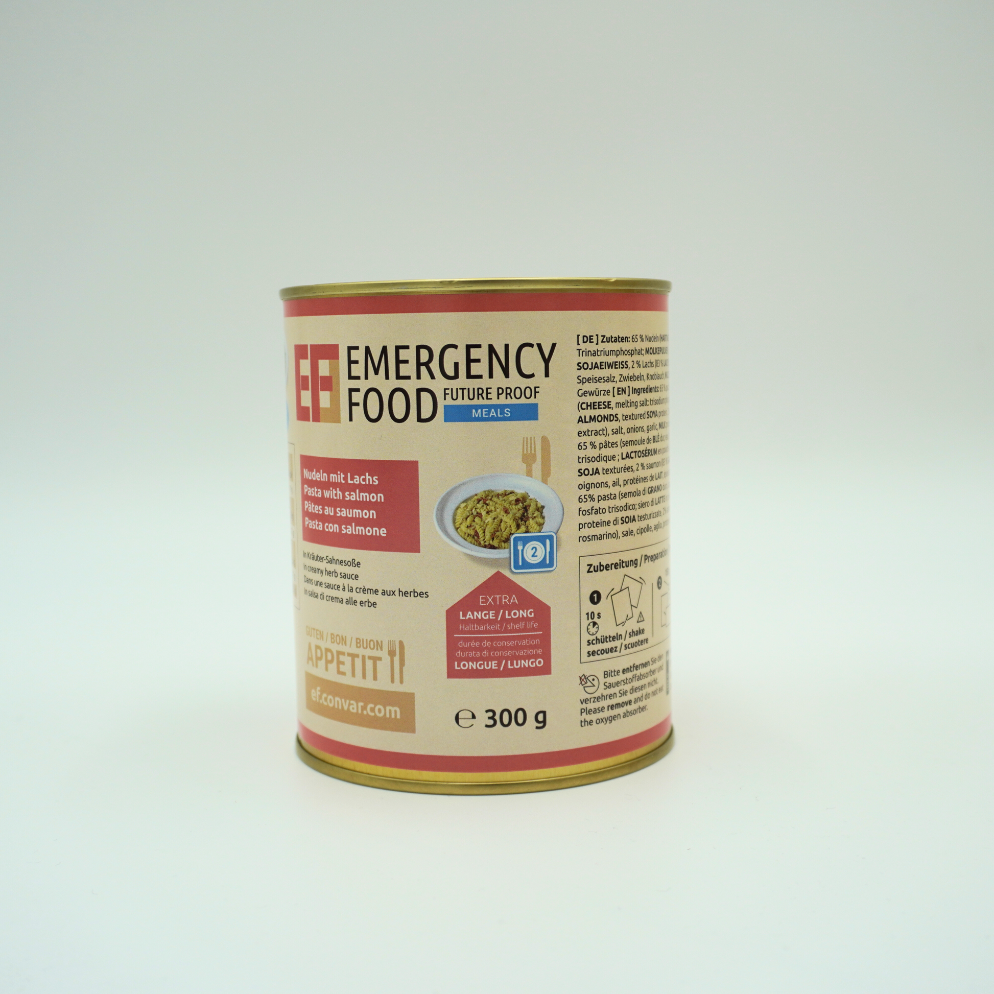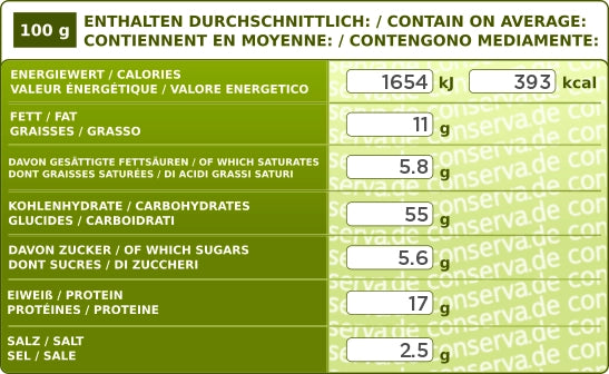 65 % pasta (gryn af hård hvede, vand), smelteostpulver (ost, smeltesalt: trinatriumphosphat; vallepulver), palmefedt, laktose, tomater, mandler, struktureret sojaprotein, 2 % laks (83 laks, bordsalt, stivelse, antioxidant: rosmarinekstrakt), bordsalt, løg, hvidløg, mælkeprotein, fortykningsmiddel: guargummi; basilikum, krydderier
